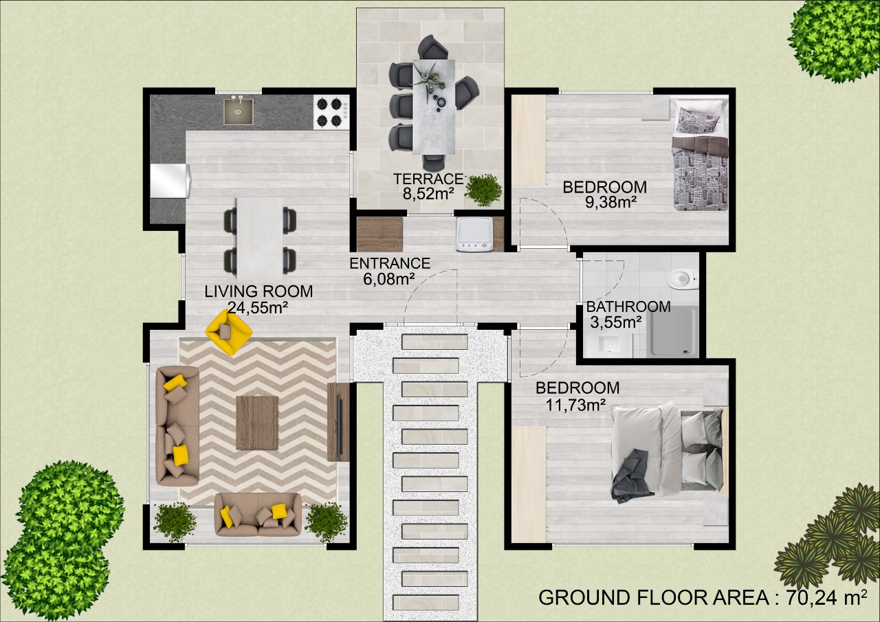 Nu Aria represents the refined elegance of modern living within a compact yet comfortable layout. Designed to welcome daylight through its large windows, it is built using sustainable materials that are kind to both the planet and your budget. Thoughtfully planned to separate daytime and nighttime living areas, its entry opens directly onto a terrace, while the overhead canopy adds architectural flair. A space not just to live in—but to feel.